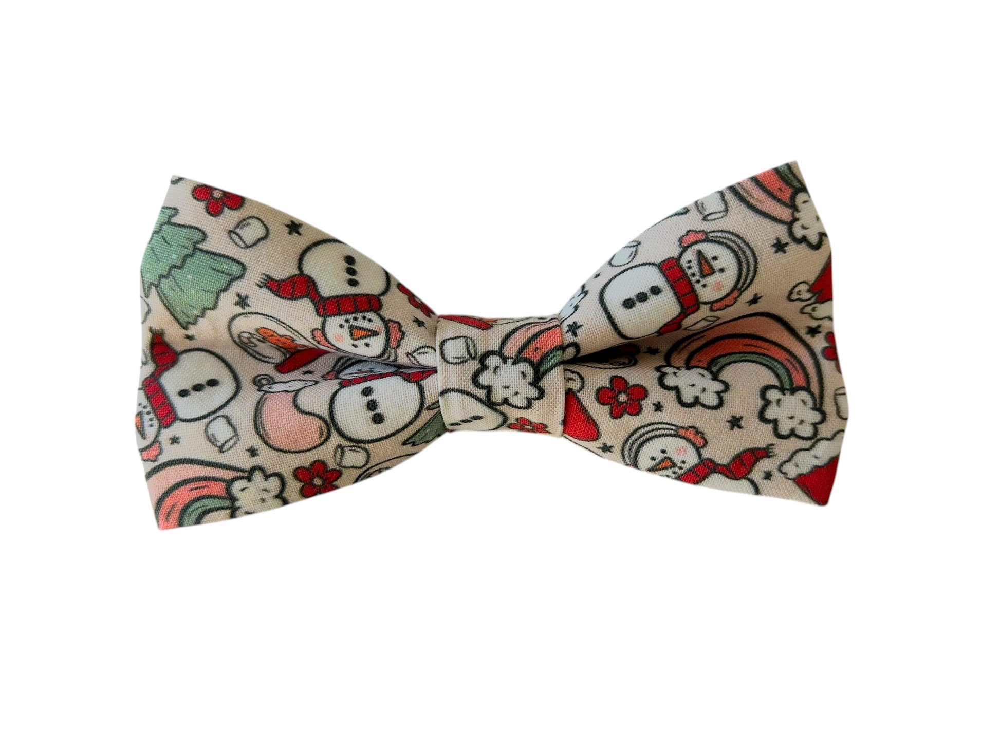 Snowmen, Christmas trees, Santa hats, snowglobes, rainbows, and stockings on light pink background