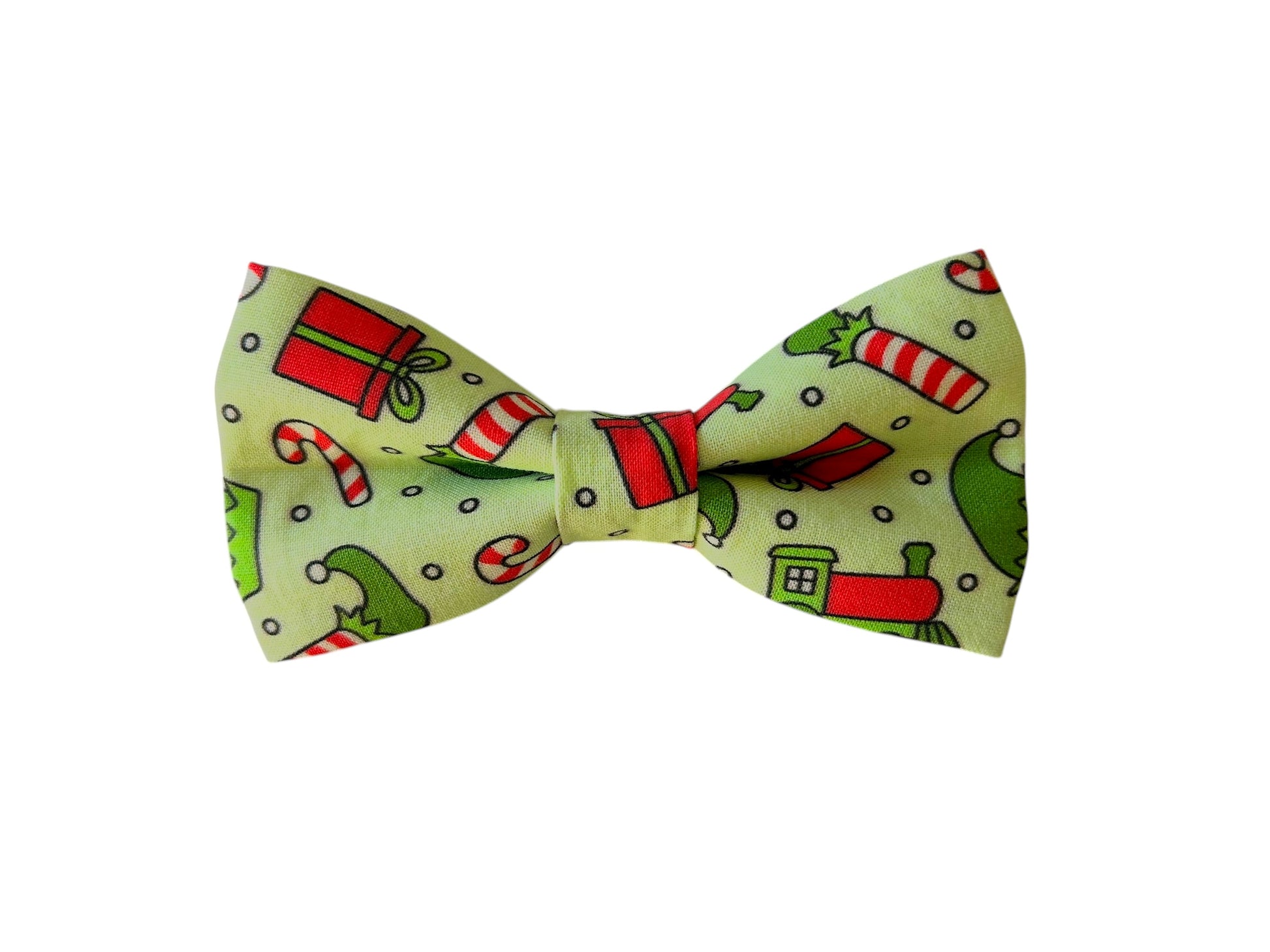 Handmade dog bow tie with two elastic strips on the back that easily slide onto your pet’s collar.