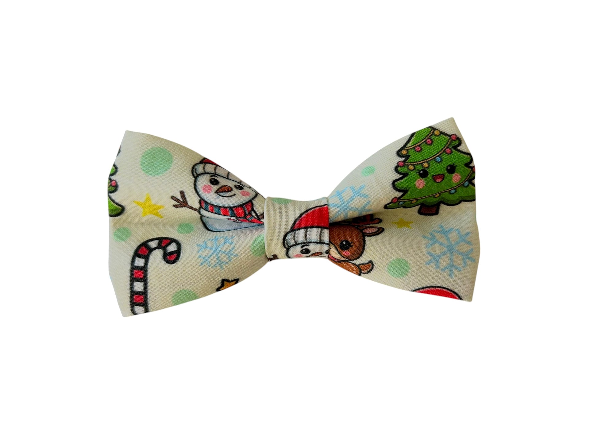 Snowmen, reindeer, Christmas trees, and candy canes on off white background with blue snowflakes and yellow stars